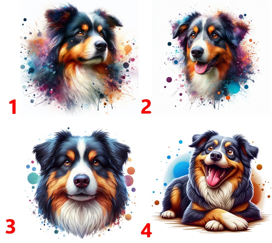 Nažehlovačka Australský ovčák tricolor - 4 motivy Barevná nažehlovačka, která přidá veselý a originální nádech do vašeho oblečení nebo doplňků. Nová technologie nažehlovaček DTF, která je vhodná pro různé textilní materiály. Lze nažehlit i na papír a karton. celý popis