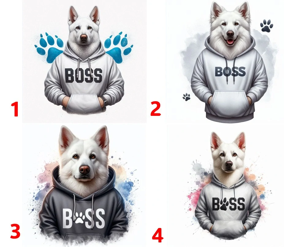 Bílý švýcarský ovčák v mikině - 4 motivy