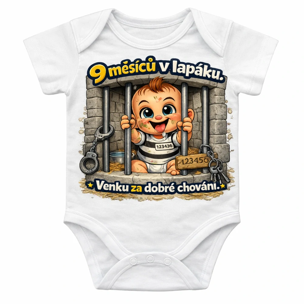 Bodýčko „Devět měsíců v lapáku“ je vtipné dětské body s originálním potiskem, ideální jako dárek k narození miminka nebo na první focení.