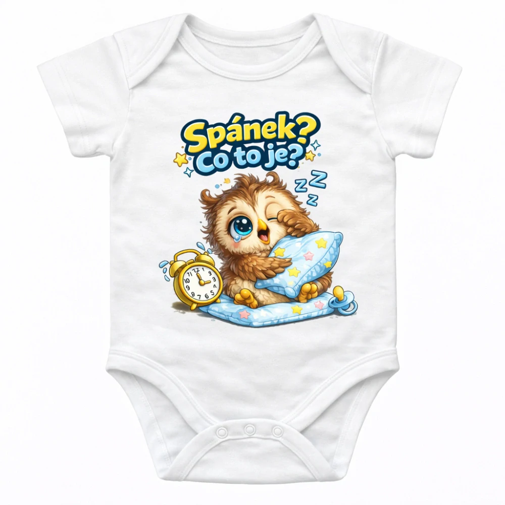 Dětské body „Sovička – Co je spánek?“ je vtipné bodýčko pro miminka s motivem noční sovy a humorným textem.