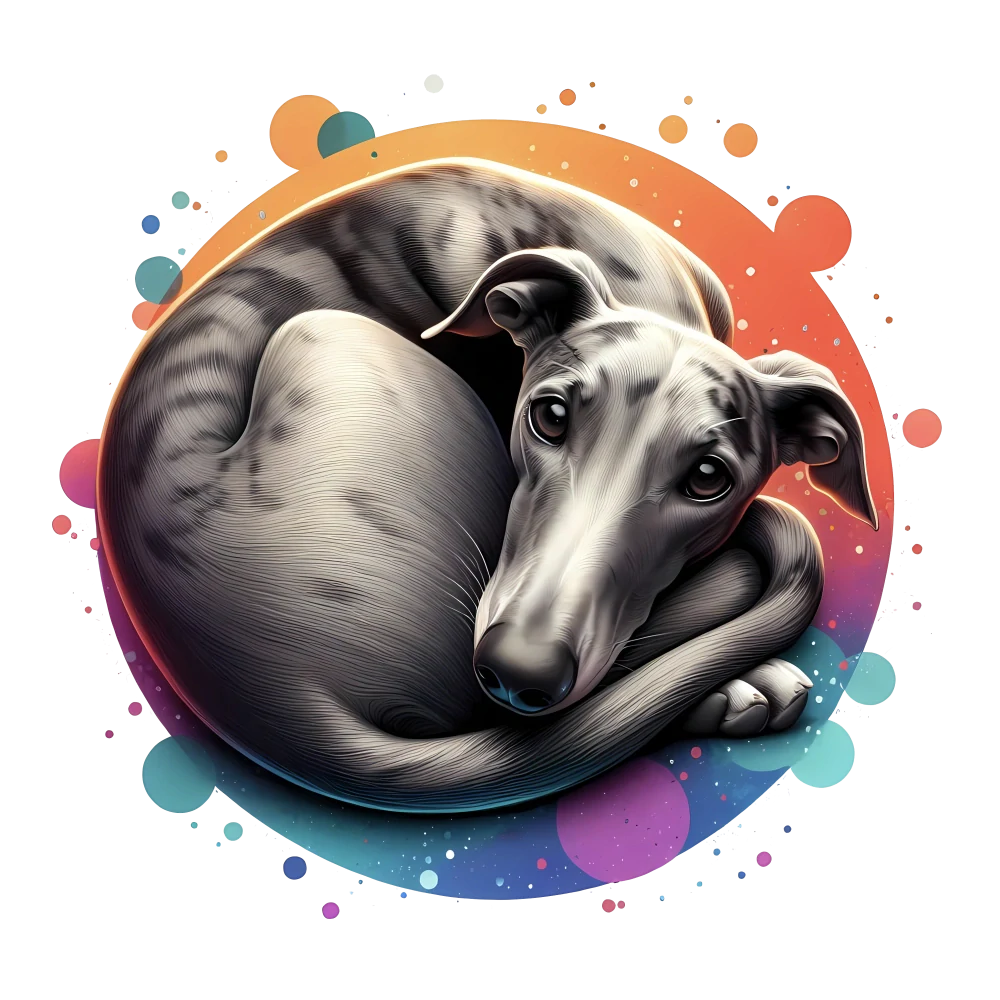 Realisticky zpracovaný chrt stočený do klubíčka v barevném kruhu vytváří kontrast mezi jemností a energií.