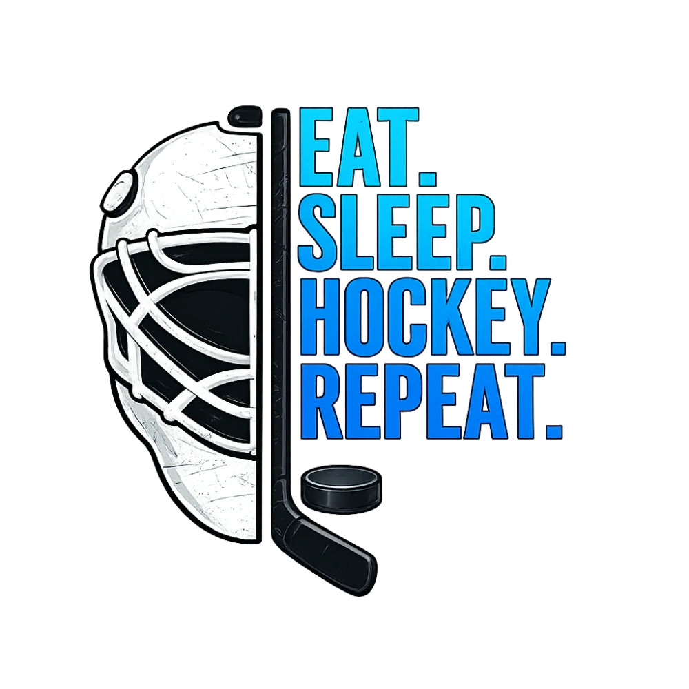 Stylová DTF nažehlovačka s hokejovým motivem a textem „Eat. Sleep. Hockey. Repeat.“, která přesně vystihuje život každého, kdo žije pro hokej.