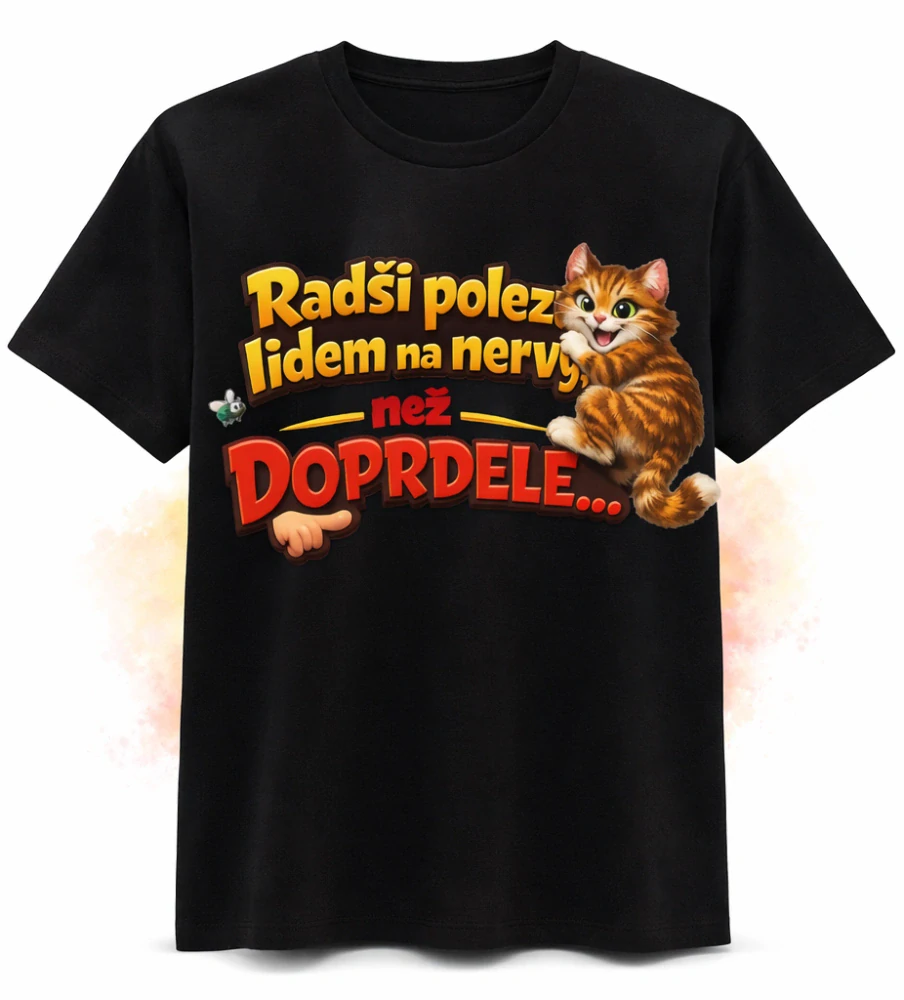 Tričko „Radši polezu lidem na nervy než do pr*ele…“ Tričko s výrazným typografickým motivem a ilustrací škodolibé kočky, která jasně sděluje postoj k životu. Text pracuje s nadsázkou, drzostí a černým humorem. Vhodné pro každého, kdo má hranici trpělivosti jasně vyznačenou. celý popis