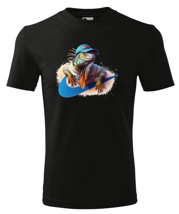 Originální tričko s potiskem leguána v mikině spojuje exotiku s městským stylem.