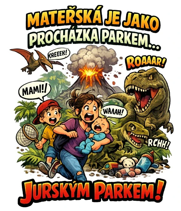 Nažehlovačka s motivem „Mateřská je procházka parkem – jurským parkem“ trefně vystihuje realitu všech rodičů, kteří denně přežívají mezi řevem, chaosem a nečekanými útoky malých dinosaurů.