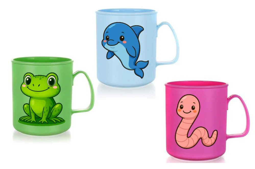 Odolný plastový hrníček s potiskem školkové značky pomáhá dětem snadno rozpoznat vlastní hrníček – ať už se jedná o jablíčko, autíčko nebo třeba sluníčko.