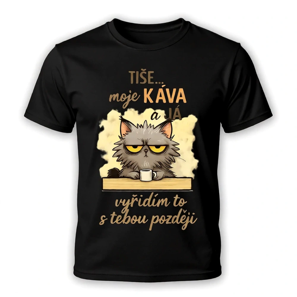 Tričko Kočka a káva 🐱☕ Tričko pro všechny, kteří milují klid, kočky a voňavou kávu.  Originální potisk s textem „Tiše… moje káva a já, vyřídím to s tebou později“ celý popis
