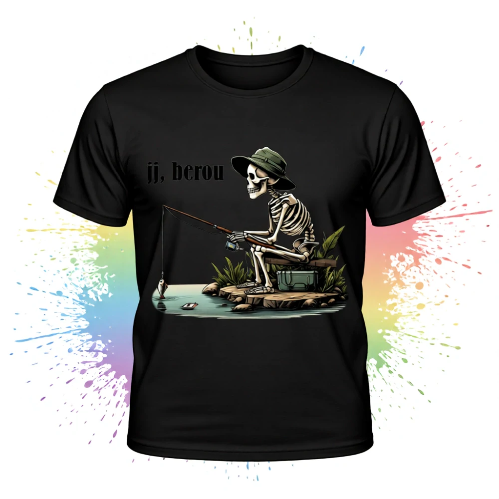 Tričko Rybář – kostlivec 🎣💀 Pro všechny, kteří berou rybaření s nadhledem a špetkou černého humoru. Tričko Rybář – kostlivec spojuje vášeň pro lov ryb s originálním motivem kostlivce, který nikdy neztrácí trpělivost u vody. Stylový potisk zaujme každého, kdo má rád netradiční designy celý popis