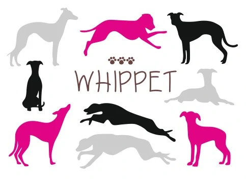 Motiv zachycuje whippeta v různých fázích pohybu i klidu – od elegantního postoje až po plný sprint.