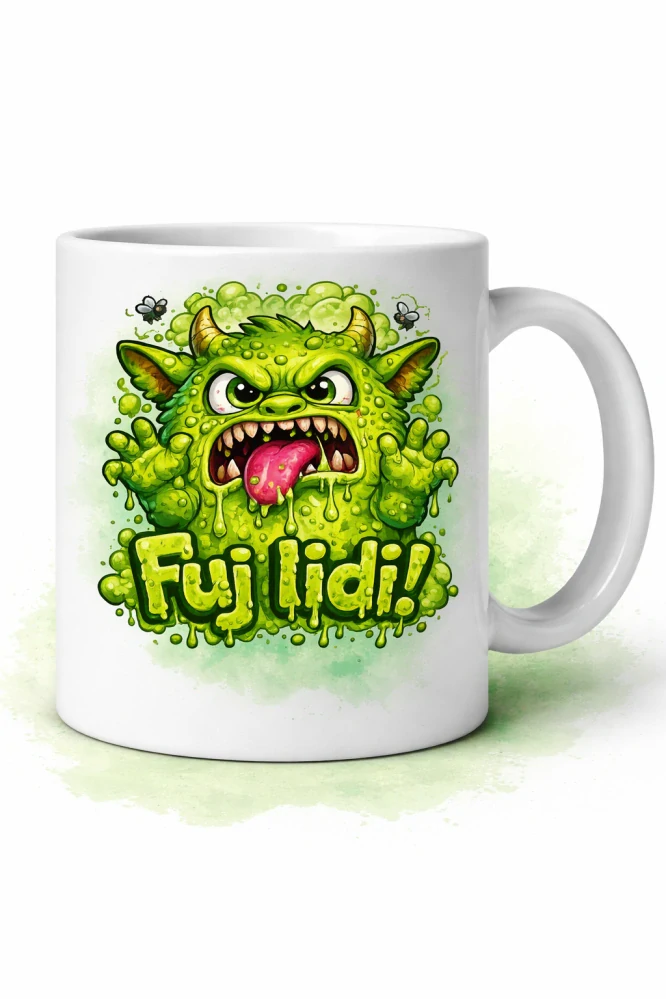 Originální keramický hrnek s potiskem zelené příšerky a textem „Fuj, lidi!!“, který perfektně vystihne náladu každého, kdo si chce dát kávu v klidu… bez lidí 😄☕